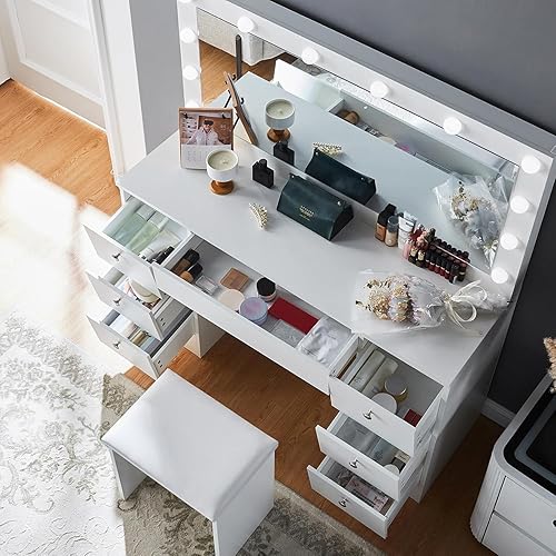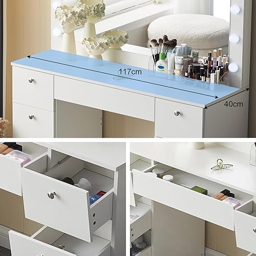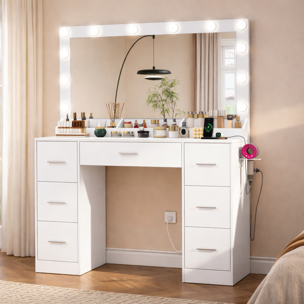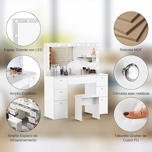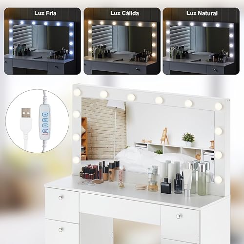 Este tocador incorpora 12 luces LED regulables, distribuidas uniformemente alrededor del espejo, simulando la iluminación de un camerino profesional.